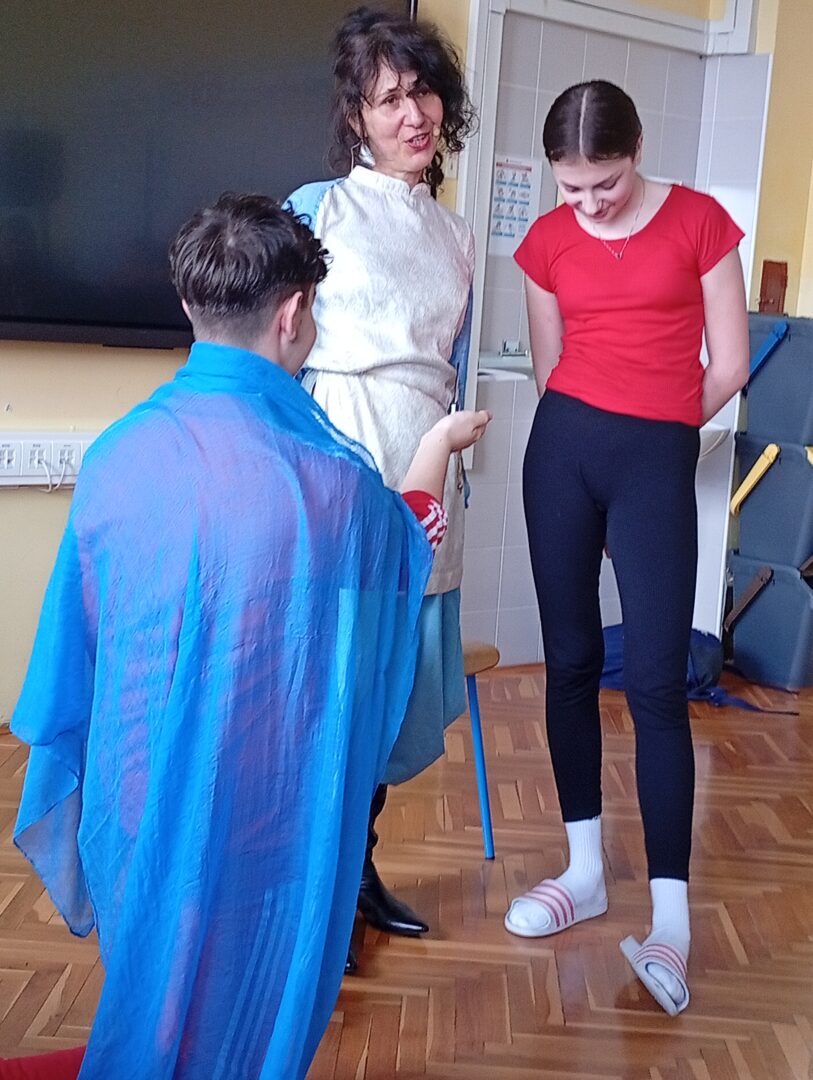 Pripovijedajući narodnu priču, mijenjajući glas, koristeći pokret i mimiku, te uvođenjem jednog po jednog učenika kao novog aktera u priči, zaokupila je pozornost svim okupljenim učenicima i nastavnicima. Učenici su na taj način i sami odglumili dio priče ponavljanjem riječi, zvukova i pokreta koje ih je pripovjedačica učila na licu mjesta.